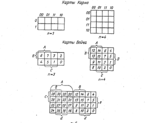 Карта Вейча (карта Карно) функции п аргументов содержит 2п клеток (по числу различных наборов) и составлена таким образом, что каждый аргумент представлен в одной половине всех клеток прямой формой, а в другой — инверсной. Пересечению полей, отмеченных какими-либо формами аргументов, соответствует клетка, содержащая их произведение. На рис.1 показаны карты Вейча при n = 3, 4 и 5.
