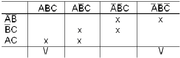 Если исходная форма функции аналитическая, то на соответствующей карте надо определить поле, занимаемое каждым элементом аналитической записи функции, и все клетки поля отметить единицами. При этом единица, уже содержащаяся в клетке, сохраняется. После размещения всех элементов аналитической записи функции на карте Вейча отмечаются символами «в» запрещенные наборы, а оставшиеся клетки заполняются нулями.
