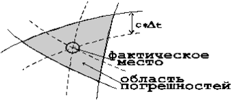 Предположим, что спутники и приемник СНС находятся в одной плоскости. Если t=0, т.е. нет погрешностей в измерении времени прохождения радиосигнала одновременно от трех спутников, то линии положения пересекутся в одной точке. В тех же случаях, когда погрешность t, то вычисленные линии положения будут отстоять от фактических линий положения на величину ct и образовывать некоторую область возможных положений приемника СНС (область погрешностей). Размеры этой области определяются величиной ct и углами пересечения линий положения. По специальному алгоритму в компьютере приемника СНС после серии измерений обеспечивается вычисление величины t, которая становится третьей координатой, определяющей позицию приемника на плоскости (рис. 4.3).