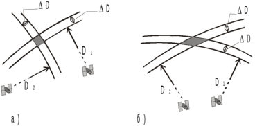 Предположим, что два спутника и приемник СНС расположены в одной плоскости (рис. 4.4). Обе линии положения определяются с погрешностью D. Тогда область возможного положения приемника СНС будет значительно меньше при угле пересечения линий положения, близком к (рис. 4.4а), чем при угле пересечения, близком к (рис. 4.4б). Возможная погрешность в определении координат за счет так называемого "геометрического фактора" может возрасти в несколько раз.