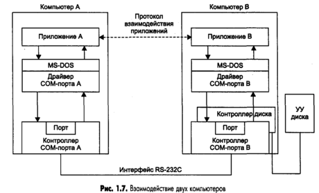 Рассмотрим случай, когда пользователю, работающему с текстовым редактором на персональном компьютере А, нужно прочитать часть некоторого файла, расположенного на диске персонального компьютера В (рис. 1.7). Предположим, что мы связали эти компьютеры по кабелю связи через СОМ-порты, которые, как известно, реализуют интерфейс RS-232C (такое соединение часто называют нуль-модем-ным). Пусть для определенности компьютеры работают под управлением MS-DOS, хотя принципиального значения в данном случае это не имеет. Драйвер СОМ-порта вместе с контроллером СОМ-порта работают примерно так же, как и в описанном выше случае взаимодействия ПУ с компьютером. Однако при этом роль устройства управления ПУ выполняет контроллер и драйвер СОМ-порта другого компьютера. Вместе они обеспечивают передачу по кабелю между компьютерами одного байта информации. (В «настоящих» локальных сетях подобные функции передачи данных в линию связи выполняются сетевыми адаптерами и их драйверами.)