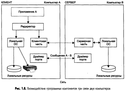 Схема взаимодействия клиента и сервера с приложениями и операционной системой приведена на рис. 1.8. Несмотря на то что мы рассмотрели очень простую схему аппаратной связи компьютеров, функции программ, обеспечивающих доступ к удаленным файлам, очень похожи на функции модулей сетевой операционной системы, работающей в сети с более сложными аппаратными связями компьютеров.