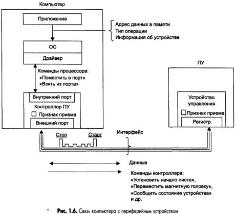 Рассмотрим схему передачи одного байта информации от прикладной программы на периферийное устройство. Программа, которой потребовалось выполнить обмен данными с ПУ, обращается к драйверу этого устройства, сообщая ему в качестве параметра адрес байта памяти, который нужно передать. Драйвер загружает значение этого байта в буфер контроллера ПУ, который начинает последовательно передавать биты в линию связи, представляя каждый бит соответствующим электрическим сигналом. Чтобы устройству управления ПУ стало понятно, что начинается передача байта, перед передачей первого бита информации контроллер ПУ формирует стартовый сигнал специфической формы, а после передачи последнего информационного бита — стоповый сигнал. Эти сигналы синхронизируют передачу байта. Кроме информационных бит, контроллер может передавать бит контроля четности для повышения достоверности обмена. Устройство управления, обнаружив на соответствующей линии стартовый бит, выполняет подготовительные действия и начинает принимать информационные биты, формируя из них байт в своем приемном буфере. Если передача сопровождается битом четности, то выполняется проверка правильности передачи: при правильно выполненной передаче в соответствующем регистре устройства управления устанавливается признак завершения приема информации.