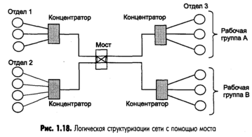 Решение проблемы состоит в отказе от идеи единой однородной разделяемой среды. Например, в рассмотренном выше примере желательно было бы сделать так, чтобы кадры, которые передают компьютеры отдела 1, выходили бы за пределы этой части сети в том и только в том случае, если эти кадры направлены какому-либо компьютеру из других отделов. С другой стороны, в сеть каждого из отделов должны попадать те и только те кадры, которые адресованы узлам этой сети. При такой организации работы сети ее производительность существенно повыситься, так как компьютеры одного отдела не будут простаивать в то время, когда обмениваются данными компьютеры других' отделов.