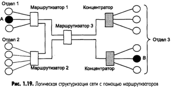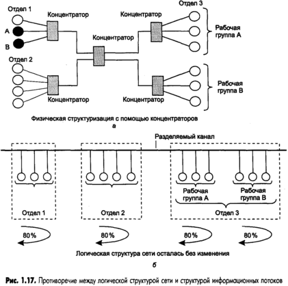Такая ситуация возникает из-за того, что логическая структура данной сети осталась однородной — она никак не учитывает увеличение интенсивности трафи-ка внутри отдела и предоставляет всем парам компьютеров равные возможности по обмену информацией (рис. 1.17, б).