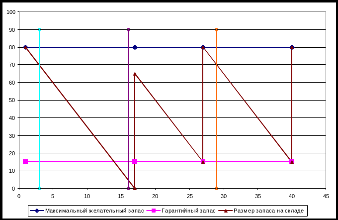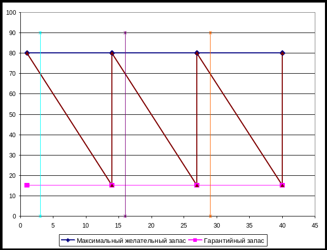 Предположим, что начальный объем запаса соответствуем максимальному желательному запасу. Как видно из рисунка 2.4, при отсутствии сбоев в поставках поступление заказа происходит в момент, когда достигается гарантийный уровень запасов. Рассчитанный по формуле (2.2) размер заказа пополняет запас до максимального желательного уровня.