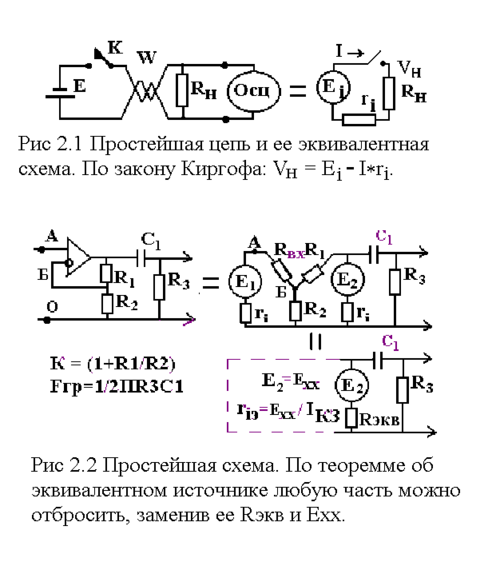 Типовые элементы цепей из сосредоточенных элементов показаны на рис 2.1, 2.2. Нас интересуют измерения в цепях, поэтому обязательно в схеме должны присутствовать измерительные приборы, например осциллографы. Кроме того нужны элементы управления, например, выключатели. Детали схем заменяются эквивалентными схемами, как показано на рис 2.1, 2:2)