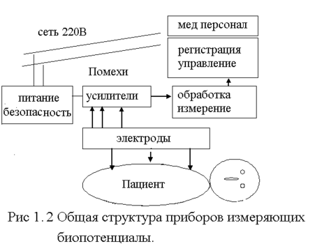 Инженеры научились измерять очень маленькие биопотенциалы - на уровне 0.01 мкВ. Напомним, что чувствительность профессионального радиоприемника составляет десятые доли микровольта, а телевизионного - десятки микровольт. Следует оценить буквально ювелирную работу инженеров по созданию медицинских приборов. Общая структура медицинского прибора, использующего измерение биоэлектрических потенциалов, показана на рис 1.4.