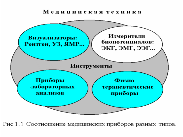 Традиционно для диагностики состояния человека использовалось наблюдение свойств, присущих организму. Температура, цвет лица, пульс, акустические тона и многое другое. Постепенно врачи вооружили себя приборами. В конце 18 века открыто биоэлектричество. Появились приборы измерения биоэлектрических потенциалов. Сегодня практически треть всего парка медицинских приборов приходится на электрокардиографы, энцефалографы, миографы. Образно соотношение разных типов приборов медицинской техники представлено на рис 1.1 Широко использу
