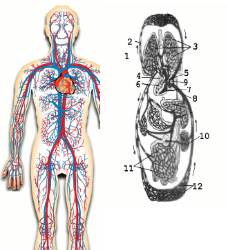 Рис 5.2.3 а) Расположение сердца и б)кровеносных сосудов человека. б) Структура кровеносной системы. 1- верхняя половина туловища. 2 - сонная артерия. 3 -легочные сосуды. 4 - левое предсердие. 5 - правое предсердие. 6,7 - желудочки. 8 - воротные вены. 9 - аорта 10 - левая почка. 11 - кровоток кишечника. 12 -Кровоток мышц тела.