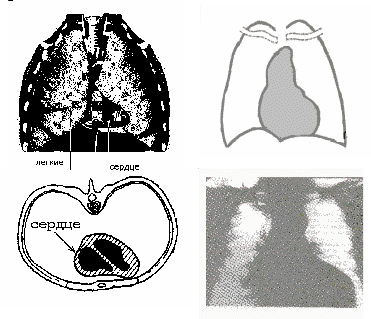 ис 5.2.1 Рентгенограмма и схемы расположения сердца. Сверху вниз слева направо: