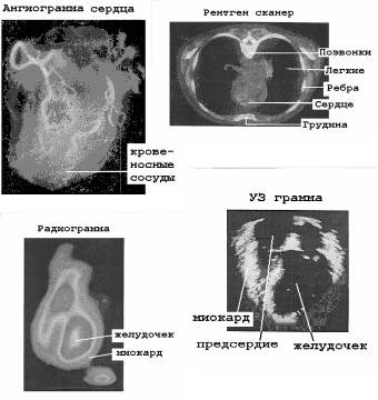 ис 5. 2.2 Изображения сердца, получаемые: 1) Рентгеном с введением контрастных веществ (ангиограмма). 2) Рентгеновский томограф. Обработка на ЭВМ ряда рентген снимков вращающегося вокруг пациента аппарата позволяет устранить затенение сердца другими органами. ЯМР томография дает подобные изображения. 3) Радиограмма: введение в кровь радиоактивных изотопов позволяет наблюдать распространение / движение меченой крови. 4) УЗ сканер (используется отражения ультразвука от тканей с разной плотностью).