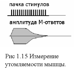 ) Исследование утомляемости мышц. Эти тесты характеризуют качество кровоснабжения и перехода возбуждения нерв - мышца. Стимул подается в области соответствующего мотонейрона и исследуется М или Н ответы на пачки стимулов разной длительности и разной частоты заполнения. Огибающая последовательности М - ответов имеет спадающую величину (рис 5. 1.14). Время начала и скорость спада характеризует утомляемость (в основном определяемом качеством кровоснабжения). Кроме утомляемости важное значение имеет измерение времени восстановления сократительной способности мышцы. После длительной пачки стимулирующих импульсов, гарантирующих утомление, подается одиночный импульс с разной задержкой. Оценивается величина латентного периода при появлении М-ответа для испытательного импульса. Обычно латентный период имеет значение 0.1-3 с. Он сравнивается с латентным периодом при стимуляции двумя одиночными импульсами (в этом случае процесс утомления отсутствует).