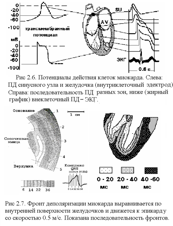 ронт деполяризации от эндокарда к эпикарду распространяется со скоростью 0.5 м/с в виде сплошной поверхности двойного зарядового слоя ДЗС (Иногда говорят "токового слоя"). Область отрицательных зарядов находится внутри желудочков. Поперечное распространение фронта может быть обьяснено деполяризацией нитей под воздействием повышенной концентрации КCl высвобождаемых из внутриклеточной среды деполяризованных клеток [4].