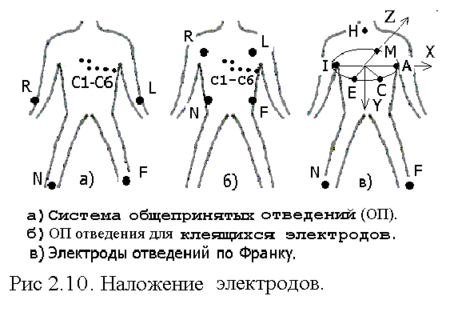 Известны другие типы отведений, из них удобный для скорой помощи "треугольник Неба" (электроды R,L,F,N.). В последнее время ОП отведения вытесняются "ортогональными" отведениями. Наиболее известные из них отведения Франка (1956г, электроды A, C, Е, I, M, F, H и нейтральный N, всего 8, см рис 2.10).