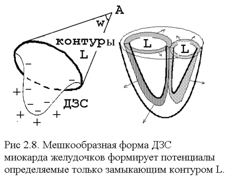 Форма фронта возбуждения желудочков и предсердий имеет вид мешкообразной поверхности двойного зарядового слоя (ДЗС) (рис 5.2.8). Электроды воспринимают сигналы ДЗС не реагируя на форму "мешка". Следовательно регистрируемая электрокардиограмма (ЭКГ) отображает не состояние текущего фронта зарядового слоя, а значение пространственного угла, под которым виден контур L ДЗС из точки электрода А. Первоначально форма контура L определялась областью раннего возбуждения межжелудочковой перег