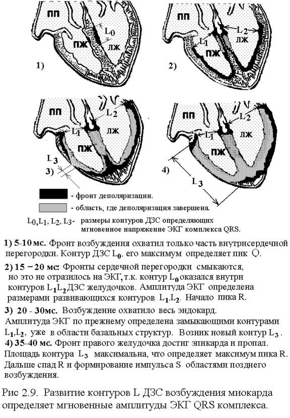 ородки. Этим формируется импульс Q (рис 5.2.9). Далее замыкающий контур ДЗС уже определен общим "мешком".На 30-той мс фронт ДЗС правого желудочка (толщина стенки которого около 0.6 см.) достигает эпикарда и пропадает. Раскрывается боковой диск L2 ДЗС, имеющий большую величину. Около 60 мс ДЗС распадается на отдельные зоны поздней деполяризации отображаемые импульсом S на ЭКГ.