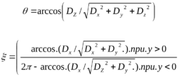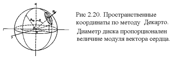 Векторкардиография может быть дополнена наглядным отображением движения суммарного вектора ЭКГ. Примером может служить программа ДЕКАРТО [5]. Программа соотносит одномоментно вычисленный вектор сердца с зоной текущего возбуждения миокарда. Рассматривая полученные сигналы как проекции единого вектора сердца, рассчитываются пространственные направляющие углы вектора сердца ξ и θ и три проекции модуля вектора сердца Dx,Dy,Dz согласно рис 5.2.21.. Для ортогональной системы отведений Франка углы и модуль вектора D рассчитывается через типовые выражения:
