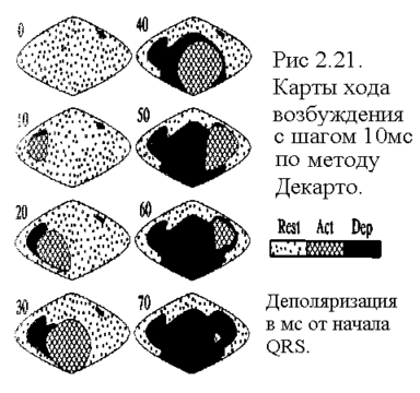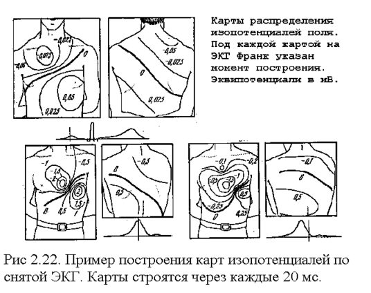 ачиная с 60 годов прошлого века активно развивается "электрокардио топография": ЭКГ с использованием множества электродов, накладываемых на поверхность тела. (1965г Амиров Р.З.- 50 электродов, 1971г Barr R.C -24 электрода, 1972г Marroko RR - 35 электродов и другие. В настоящее время в Росси внедряется методика с использованием 35 электродного пояса, Рябыкина Г.В.). Использование множества электродов дает возможность развития двух методик расшифровки информации: первая - анализ ЭКГ в каждой точке поверхности тела, где установлен электрод (считается униполярным, результат анализа условно соотносится с конкретной областью миокарда), вторая - построение карт эквипотенциалей ЭК сигнала на поверхности тела в синхронные моменты времени. Карта эквипотенциалей (Рис 5.2. 23) несет информацию о состоянии процессов деполяризации / реполяризации миокарда. Естественно, решение задач построения топологических карт зонного анализа ЭКГ и построение эквипотенциалей опирается на мощное программное обеспечение, например, в пакете МатЛаб. Увеличение числа электродов усложняет трудоемкость процедуры обследования. Поэтому важно провести сравнение различных систем по информативности и эффективности проведения диагностических заключений. Эта работа до сих пор четко не проведена. При этом важно понимать, что разные формы представления: ЭКГ 12 ОП отведений, ЭКГ по Франку, ВКГ, ЭКГ картирование являются преобразованием одного и того же кардиосигнала и вопрос только в том, насколько врачу удобно ориентироваться, отыскивать диагностические признаки в каждом из этих инженерных решений.