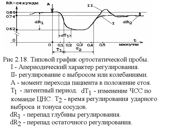 Более надежно, чем анализ спектров, процессы регуляции и гомеостаза отображаются и контролируются переходными процессами при пробных нагрузках. Нагрузки даются приемом лекарств или искусственной стимуляцией или другим методом. Наблюдается переходной процесс. Для анализа систем регуляции сердца широко используется нагрузочная, лекарственная, эмоциональная (проба Вольтасара) и ортостатическая проба. Рассмотрим последнюю. Человек с наложенными ЭКГ электродами из положения лежа должен встать. (В последнее время отработана методика, где пациента просят сесть). Фиксируется кривая изменения ритма сердца (в последнее время контролируется так же ход других параметров ЭКГ: аST, aT, tQT). Когда человек встает, кровь отливает в ноги и ритм сердца должен учащаться для компенсации возникающей недостаточности кровоснабжения мозга и миокарда. По форме переходного процесса графика RR делается заключение о состоянии тонуса и системы регуляции сердца. Ход кривой ритма и информативные параметры показаны на рис 5.2.19. (Ортостатическая проба является древним методом. В периоды снижения тонуса при переходе из горизонтального в вертикальное положение у ослабленного человека кружится голова и сильно учащается сердцебиение).