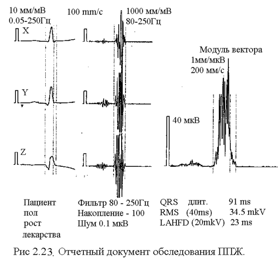 Обычно используется фильтр ВЧ Баттерворда 5 - 6го порядка. Для сохранения коротких фрагментов полоса частот усилителя сигнала ЭКГ увеличена с 75Гц до 250Гц. (В целом выделяется ЭКГ в полосе частот от 40 до 250Гц). В 80х годах с помощью такой методики на сегменте ST выявили присутствие шумоподобного устойчивого ЭКГ сигнала уровнем от 10 до 40 мкВ. Этот сигнал и получил название поздних потенциалов желудочков - ППЖ. Клинические исследования позволили связать наличие ППЖ с опасными аритмиями и большим риском внезапной смерти. С 1991г регистрация ППЖ стала типовой методикой ЭКГ обследования. Отчетный документ представлен на рис 5.2.24.