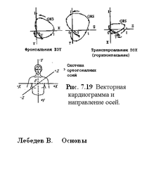 В графиках ЭКГ в ортогональной системе Франка можно исключить время и регистрировать зависимость модуля амплитуды от углов вектора сердца в трех плоскостях. Получается векторная электрокардиограмма (ВКГ). ВКГ не нашла распространения в диагностических обследованиях, т.к. не улучшает информативность типовых кадров ЭКГ ОП отведений. Однако ВКГ имеет одно положительное свойство: т.к. векторные параметры есть параметры отношений, то они более стабильны при изменении массы пациента, что важно при наблюдения хода некоторых заболеваний. Пример ВКГ представлен на рис 5.2.20.
