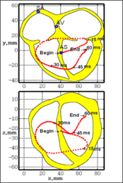 Ряд заболеваний сердца связан с общим состоянием миокарда, однако многие заболевания поражают локальные его зоны. Эти зоны необходимо обнаруживать, визуализировать, определять их координаты. Для измерения координат положения электрического диполя в миокарде разработан метод, основанный на совмещении реально измеренных потенциалов на электродах и сравнении их с расчетными потенциалами модели вектора сердца. Моделируемый диполь перемещается внутри зоны миокарда до тех пор, пока его расчетные потенциалы на всех электродах не совпадут с измеренными. В этот момент координаты реального и моделируемого источника считаются одинаковыми, они выводятся как результат измерения. Естественно, что измеренные точки координат изменяются во времени, вырисовывают треки движения, как показано на рис 5.2.27 Интересно выделять и измерять координаты малых неоднородностей, регистрируемых методом ЭКГВР.
