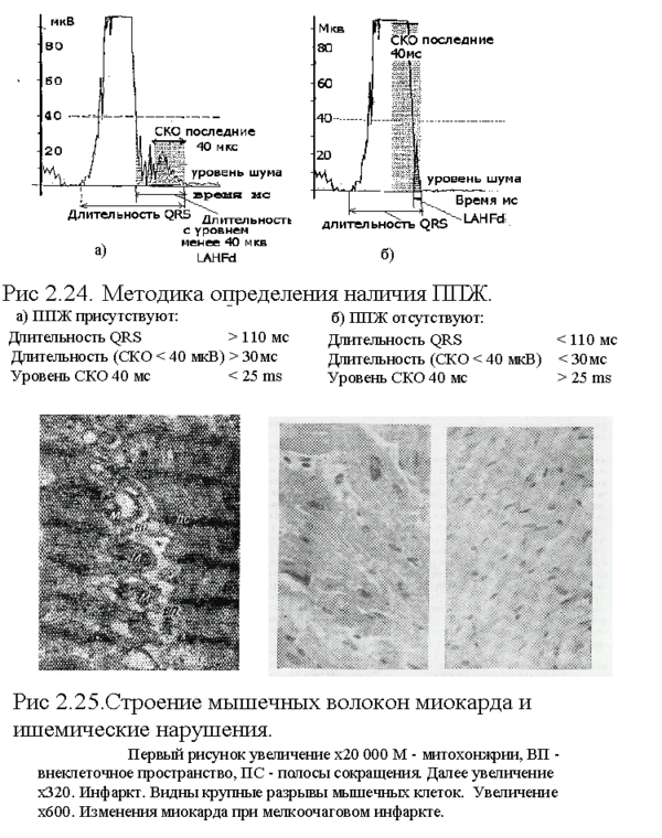 ритерием присутствия ППЖ является совокупность признаков: tQRS>110 mc, LAS40>30mc, RMS40mc<25 mkB. На рис 5.2.25 а) ППЖ отсутствуют, 5.2.25 б) - присутствуют. (tQRS- длительность комплекса по уровню шумов. LAHFd - Low Ampltude Hige Frequensy duration - длительность высокочастотных низкоамплитудных потенциалов, RMS40mc - Root mean square - среднеквадратичное отклонение последних 40 мс). Можно указать некоторые особенности, позволяющие приблизиться к пониманию физиологии возникновения ППЖ. На рис 5.2.26 представлено строение миофибрил миокарда и изображение миокарда, пораженного ишемической болезнью и мелкоочаговым инфарктом. Видны нарушения структуры миофибрилл, в этих нарушениях возникают застойные явления. При механической систоле плазма может выдавливаться из этих зон, создавая всплески неравновесной концентрации ионов, потенциалы которых могут регистрироваться. У здорового сердца зона ST-T свободна от шумовых всплесков.