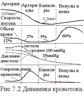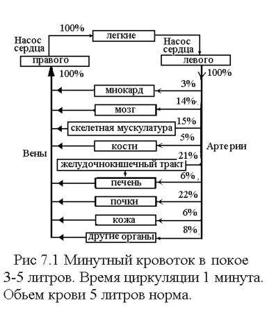 На рис 5.7.1 показано распределение обьемов потока крови по телу человека. Полный оборот кровотока происходит примерно за минуту (80-90 ударов сердца), средняя скорость кровотока примерно 5 литров в минуту (при физической нагрузке до 15 литров в минуту). Среднее значение артериального давления определяется величиной минутного выброса крови миокардом (МО) и значением общего периферического сопротивления (ОПС) току крови.