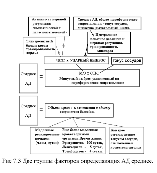 точки зрения общих физических соотношений артериальное давление определяется большим рядом факторов: силой ударного выброса сердечной мышцы, частотой сердечных сокращений, общим объемом циркулирующей крови в отношении к общему обьему бассейна сосудистой системы, эластичностью артериальных сосудов, резистивностью капилярных сосудов (в том числе и вязкостью крови), и тонусом сосудов: способность изменять сечение, регулировать ток крови. Сила ударного выброса миокарда зависит от тренированности миокарда и наполняемости предсердий (и, далее, желудочков): в первую очередь от величины возвратного венозного давления. Определенную роль играет активность нервной регуляции блуждающего нерва. Это большое количество факторов охвачено целым рядом регуляторных систем, использующих барорецепторы и рефлекторные реакции исполнения.