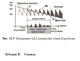 ердечная систола выталкивает кровь и она волной распространяется по аорте и артериям. Измерение АД производится при механическом пережиме артерии надуваемой манжетой (рис 7.5). Когда стенки артерии смыкаются, систолическая волна их раздвигает и происходит турбулентный прорыв, сопровождающийся характерным звуком: он называется "тоном Короткова", (Метод измерения АД Короткова 1926г). Тоны Короткова прослушиваются фонэндоскопом, размещаемым под манжетой над локтевой лучевой артерией. Процедура измерения АД включает начальную накачку давления в манжету до величины, заведомо превышающую систолическое давление (обычно до 70- 210mm Hg) и плавное снижение. На рис 5.7.5 показаны процессы изменения тонов Короткова при снижении д