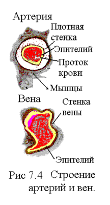 Кровоток в сосуде определяется перепадом давления на входе и выходе сосуда, отнесенным к сопротивлению потоку этого сосуда. Сосудистый тонус - характеристика сокращения сосудов и сосудистого обьема. Сосуды могут сокращаться так, что отключается кровоток отдельных органов: желудка, печени, кожи. Изменяется просвет артерий, артериол, вен. На рис 5.7.4 показано строение артерий и вен. Они содержат гладкую мускулатуру, ее иннервация определяет тонус. Капилляры имеют внутренний просвет от 2 до 40 микрон и не участвуют в изменении кровотока.