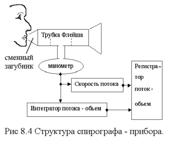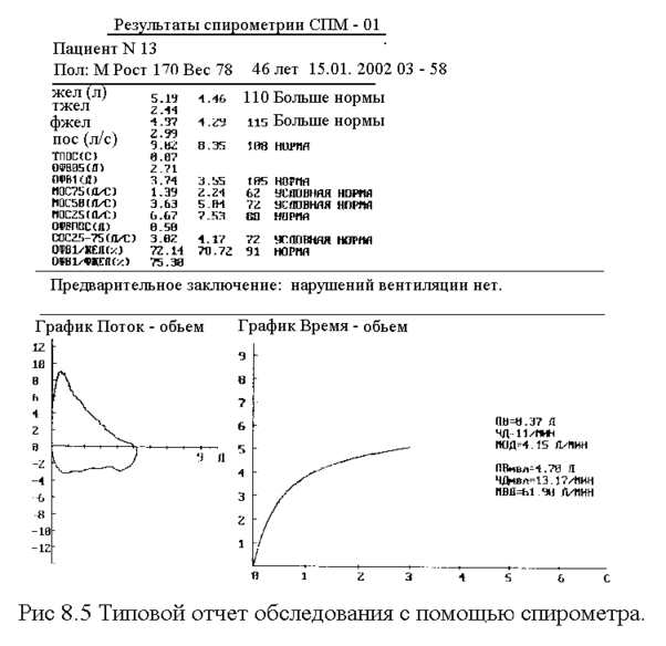 пирографы строятся на принципе измерения скорости потока воздуха с использованием легких вертушек или специальных "дыхательных" трубок. Например, трубка Флейша имеет две калиброванные сетки, установленные на пути потока. Ими создается сопротивление воздуху, в результате между сетками изменяется давление, которое фиксируется манометром. Что бы не было затруднений дыханию, создаваемое сетками повышение давления обычно выбирается не более 10 см Н2О. Структурная схема такого спирографа приведена на рис 5.9.4. Вид отчетного документа представлен на рис 5.9.5.