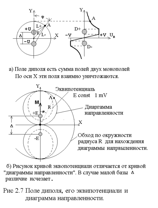 Диаграмма поля UД(Ŕ,φ), Ŕ=const в функции угла φ в обоих случаях предстанет в виде восьмерки (см рис 2.7). Это диаграмма направленности поля диполя. В отличие от монополя поле диполя UД (при φ = const, Ŕ>>ℓ) спадает уже как квадратичная гипербола (В зоне Ŕ<<ℓ поле нарастает с увеличением Ŕ). Резкое падение поля с расстоянием затрудняет измерение глубоко лежащих от поверхности тела диполей. На оси симметрии между источниками D (перпендикулярно вектору М диполя) поля двух монополей в точности компенсируют друг друга. На этой линии (плоскости) поле диполя равно нулю.
