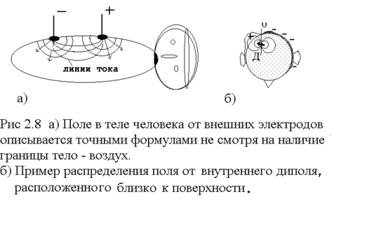 Как и при рассмотрении монополя, мы можем выделить русла тока и произвольно изменять ρ в каждом из них. Общая форма поля не изменяется. Здесь, как и для случая монополя, мы снова получаем практически важный результат: полная картина поля от электродов, расположенных на поверхности тела точно описывается в достаточно простых формулах, несмотря на то, что половина проводящей среды отброшена.