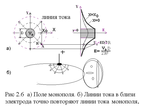 В первой формуле не требуется знания удельного сопротивления ρ, а во второй - D. Получен интересный и важный результат: форма поля одинакова для сред с разными ρ - от пустоты до серебра. В одной крайности электростатика, во второй - прекрасно проводящее тело. Это свойство очень полезно: в силу независимости формы поля от ρ мы можем заменять ρ в разных руслах тока без изменения общей структуры поля. Результат имеет практическую значимость: например, приложенный внешний электрод создает поле совпадающее со случаем замены одной половины нашей сферы на пустоту. Т.к. общее поле неизменно, то мы знаем форму поля под электродом совершенно точно, не смотря на неоднородность пространства (см рис 2.6 б).