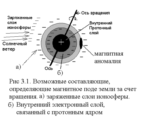Внешний электрический заряд Земли определяется солнечным ветром, состоящим в основном из электронов, внутренний, в районе ядра, возможно разделенными протоно - электронными слоями (электронный слой ближе к поверхности, протонный - к ядру). Вращение расслоено заряженного шара создает магнитное поле. Неоднородность поверхности Земли приводит к неравномерности заряда по поверхности. Возможная прецессия внутренних слоев ядра и нестабильность внешних ионосферных слоев создает дрейф магнитных полюсов. Такая интерпретация позволяет обьяснить происхождение магнитных бурь, дрейфа полюсов и даже их смену в прежние исторические периоды (см рис 3.1).