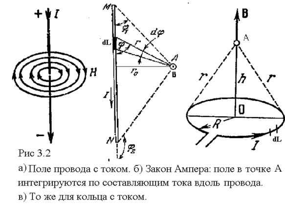 Магнитное поле описывает конкретное физическое явление: движущиеся заряды воздействует на другие движущиеся заряды на любом расстоянии. Это открыл Ампер (рис 3.2). Два провода длинной L с током i ампер на расстоянии R притягиваются (если токи текут в одну сторону) , или отталкиваются (токи в разные стороны) с силой взаимодействия F: