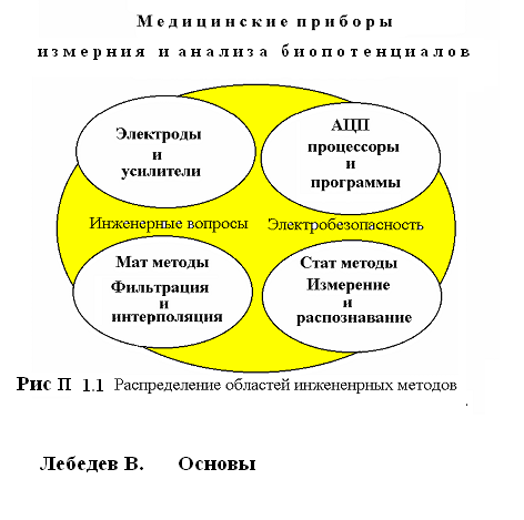 Условно распределение инженерных задачь построения медицинских приборов измерения и анализа биопотенциалов показано на рис 1.1. Ниже последовательно разбираются конкретные инженерные методы с целью освещения круга вопросов построения приборов. Это электроды, усилители, АЦП и ввод в ЭВМ, основные программные задачи. Еще 50 лет назад каждый инженер использовал логарифмическую линейку, учебники и справочники. Сегодня используются программы ЭВМ типа Мат Лаб (Mathlab) Мат Кад (Mathcad), Консол (Consol Maltiphesics), и др., учебники и справочники. По этому изложение идет в ознакомительном ключе с разьяснением основных принципов применения.