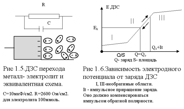 ри протекании тока в раствор электролита под анодом выделяется ион Fe2+ (для электрода из стали), а гидроксильные группы ОН- выделяется под катодом и внедряются в плазму тела. Происходит возбуждение клеточных структур. Внедрение избыточных гидроксильных групп ОН- приводит к возникновению раздражений кожного покрова. Поэтому установлена допустимая безопасная плотность постоянного тока - 0.01мА/см2. Однако для целей электростимуляции и физиотерапии приходится использовать плотности токов в 1000 раз большие: безопасность достигается применением импульсных и переменных токов. Наличие емкости перехода ДЗС позволяет использовать сильные импульсные токи, если среднее значение остается в допустимых пределах. Естественно такие импульсы должны быть редкими и короткими. При повышении частоты импульсов необходимо использовать двуполярные импульсы с нулевым средним значением (устранять постоянную составляющую). Принято использовать обобщенную величину: произведение тока в импульсе на его длительность, т.е. привносимый заряд. Накопление заряда за время одного импульса не должно увеличивать заряд ДЗС выше конкретной для данного электрода величины, т.е. не должно выводить за линейный участок II графика рис 1.6. Электрод из платины сохраняет свои характеристики на участке II при вносимом заряде 0.3 - 0.4 мкКл/мм2 , из стали 0.4 - 0.8 мкКл/мм2, из тантала - 0.934 мкКл/мм2. Импульс обратной полярности должен возвращать рабочую точку обратно в центральную часть графика до появления следующего импульса. (Предельное значение вносимых зарядов изменяют потенциал ДЗС примерно на 1В.) Работа в области обратимого участка является обязательной для медицинских электродов: в этом случае не наблюдается раздражающих действий.