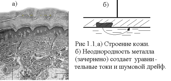 Как видно из таблицы 2 разность электродных потенциалов не должна превышать значения 100 мВ. Однако принято, что усилитель биопотенциалов (УБП) должен быть устойчив к величине разностного электродного потенциала в пределах +/- 0,3В. Эта величина (ныне устаревшая) записывается в требованиях к каждому УБП. Загрязнение электродов приводит к возникновению не контролируемых разностей потенциалов. Возникают местные уравнительные токи, как условно показано на рис 1.2. Появляются повышенные (избыточные) шумы электрода и дрейф электродного потенциала. Даже если величина дрейфа составляет всего 1% от значения электродного потенциала, он будет в 1000 раз превышать полезный биосигнал (имеющий величину доли милливольт