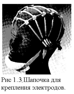 ). Электроды для электроэнцефалографии (ЭЭГ, рис 1.4) Число электродов в методиках ЭЭГ обычно велико. Принята международная система из 19 электродов (так называемая система 10/20. Цифры обозначают процентное деление расстояний лоб – затылок и ухо – ухо). Электроды крепятся на "шапочке". “Шапочка” позволяет смещать электроды для учета размеров головы. Индиферентный (заземляющий) электрод устанавливается на мочку уха. Диаметр электродов 10мм. В отличие от ЭКГ отрицательный потенциал на сигнальных электродах дает положительное отклонение графика ЭЭГ.