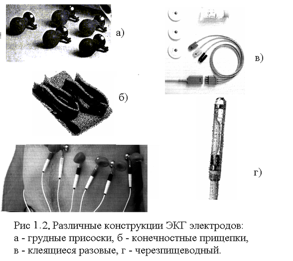 ) многоразовые электроды делятся на конечностные и грудные. Первые обычно имеют конструкции прищепок, вторые - присосок. Кроме этого используется крепление электрода эластичным бинтом: это обеспечивает уверенную фиксацию в условиях, когда по методике обследования пациенту требуются изменять положение тела или совершать движения.