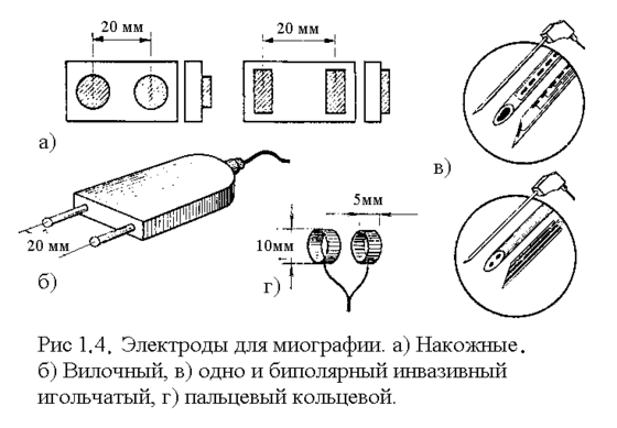 ) Электроды для электромиографии (ЭМГ). Особенностью методик ЭМГ обследования является одновременное использование токовых электродов, стимулирующих возбуждение нервов и "сигнальных" (бестоковых). Как стимулирующие, так и приемные электроды попарно обьединены в удобный для руки держатель. Типовое расстояние между электродами 20 мм. На рис 1.5 показаны некоторые варианты приемных и токовых электродов. Одновременно в комплект электродов входят варианты, обеспечивающие произвольное взаимное расположение электродов, крепящихся эластичным бинтом.
