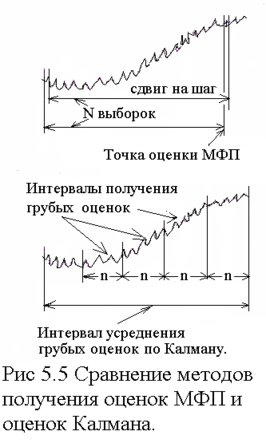 В этом случае за каждый шаг в реальном времени на ЭВМ обрабатывается всего n << N отсчетов сигнала ( рис 8.5). Дополнительно требуется проводить описанные выше простейшие операции обьединения оценок. Калман и Бьюиси показали, что при использовании подобной процедуры потери точности по отношению к строгому алгоритму МФП не велики, а загрузка ЭВМ снижается примерно в N/n раз.