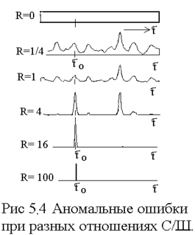 Отношение сигнал / шум имеет отдельное обозначение: R=2Е/N0. Если значение R недостаточно велико, например меньше 6, то возникают ложные пики ру(τ). На рис 8.5 представлено изменение ру(τ) для разных значений R. Вероятность появления аномальных ошибок определяется значением отношения сигнал/шум R и числом интервалов размещения сигнальной функции g(τ) на априорном диапазоне существования τ (а также выбранным порогом обнаружения). Если интервал существования τ содержит М позиций и они равновероятны, то на каждой позиции установленный порог может быть пересечен шумовым пиком R с конкретной вероятностью Рлт. Нам необходимо определить вероятность ложного пересечения хотя бы на одном из М наблюдаемых интервалов. Вероятность не пересечения на М интервалах равна (1-Рлт)М. Вероятность пересечения хотя бы на одном их М интервалов равна: 1-(1-Рлт)М или примерно МРлт.. Таким образом уровень ложных тревог растет линейно с увеличением числа возможных позиций сигнала.