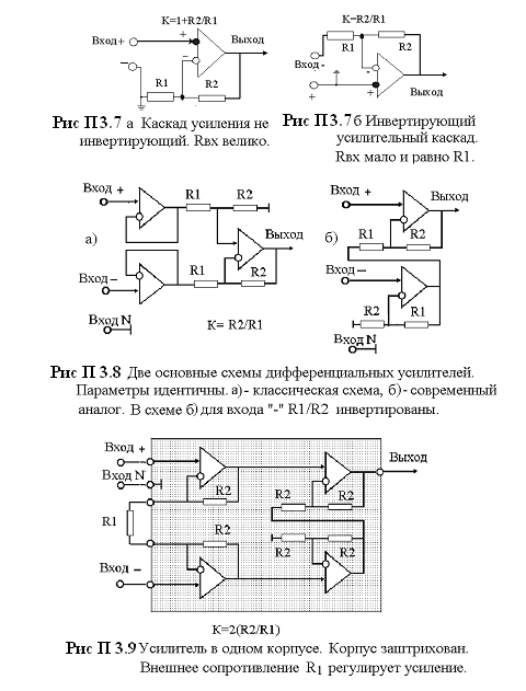 Дифференциальный усилитель на одном ОУ выполнить нельзя, т.к. входное сопротивление прямого и инвертирующего входов очень различно. Применяют комбинацию узлов рис 2.6а,б. На рис 2.7а представлен "классический" парафазный усилитель, на рис 2.7б и рис 2.8 современные варианты такого усилителя. Схемы эквивалентны по параметрам.