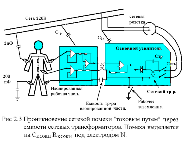 На рис 2.3 представлена полная схема проникновения сетевых помех, учитывающая наличие емкости между обмотками питающего трансформатора (так называемую проходную емкость питающего трансформатора. Обычно она близка к 500пф). Получается, что емкость на сеть 2 пФ увеличилась в 250 раз. Этот путь прохождения помехи может считаться генератором помехового тока. В общей системе пациент, усилитель, трансформатор блока питания, сеть, помеховый ток выделяет помеховое напряжение на Rкожи под электродом N.
