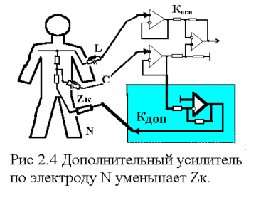 Уменьшение сопротивления электрод-кожа под нейтральным электродом N ( рис 2.4). Так как величина синфазной помехи однозначно определяется Z кожи в цепи электрода N, то стараются использовать специальные схемы уменьшения этого сопротивления. Если Rкожи =0, то помеха отсутствует. Общеизвестно, что отрицательная обратная связь в усилителях уменьшает выходное сопротивление каскада. Это свойство обычно и используется. В цепь электрода N включается усилитель, для которого Z кожи является выходным сопротивлением. Как результат, Z кожи уменьшается в К раз (К - коэффициент усиления дополнительного усилителя). Обычно К выбирается не выше 100 из за опасности самовозбуждения.