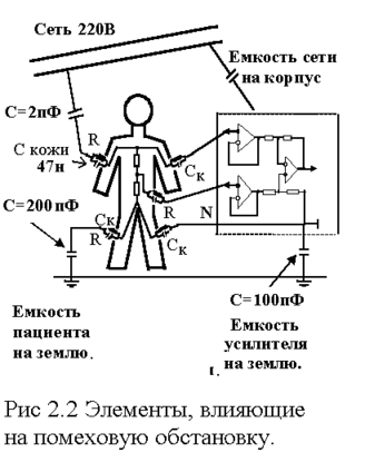 Пути проникновения помех. Помеха от сети попадает на тело пациента и конструктивные элементы усилителя. Основные пути прохождения помехи: 1) через емкость от провода осветительной сети на тело пациента 2) то же на элементы усилителя и 3) через трансформатор питания усилителя (при питании от сети 220В). Наглядно эти пути проникновения сетевой помехи представлены на рис 2.2. Человек считается изолированным от окружающего пространства. Величина внутреннего сопротивления тела человека составляет единицы ом. Поэтому токи, наводимые внешними ЭДС помехи создаются внутри тела разности потенциалов на уровне долей мкВ. Это позволяет утверждать, что внутренняя среда эквипотенциальна: наводимые токи не создают разностей потенциалов. Другими словами наводимые помехи "синфазны" во всех точках тела (их так и называют "синфазными"- СФП).